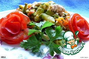 Обжарить кабачки порезанные соломкой (снять со сковороды на тарелку), отдельно спассеровать лук с морковью, туда же потом добавить куриную грудку порезанную полосками. Соединить все вместе с кабачками немного обжарить, добавить зелень, перемешать, выключить, дать чуть остыть и по- желанию можно добавить мелко порезанный чеснок, можно есть со сметаной, можно просто так наслаждаться таким вкусным блюдом!!! Очень вкусно!!!