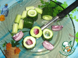 Огурцы делим на 6 частей. Удаляем специальным ножиком серединку(солим чтоб дал сок,промываем). Лук режим на 6 частей. Начиняем середину огурчиков .