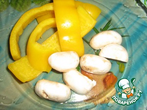 Перчик нарезаем полосками (лучше бланшировать). Шампиньоны режим на пополам.