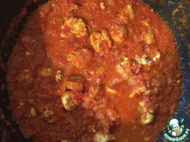 Когда лук обжарится, отправить вслед за ним наши истомившиеся в ожидании помидорчики. Как только они "заговорят", булькая, туда же имбирь, чесночок и перчик чили. Чуть посолим. Добавим прованских травок.