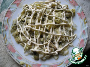 • Выдавливаем чесночок. Рисуем майонезные узоры, совсем немного.