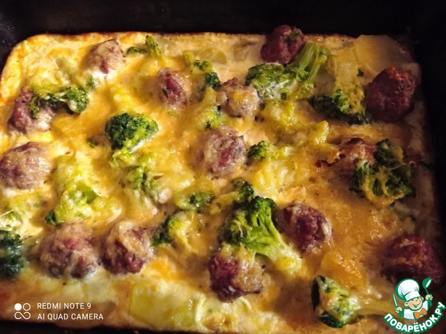 Картофель, брокколи и мясные шарики уложить в форму, присыпать тертым сыром.