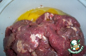 мясо поместить в емкость с яйцами, посолить, поперчить, тщательно перемешать,