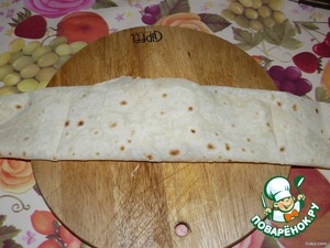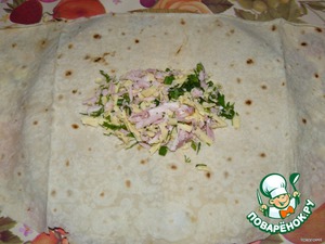Лаваш делим на две части. На лаваш выкладываем начинку и заворачиваем.