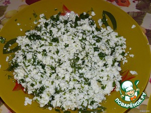 Для творожной начинки: творог разминаем, выдавливаем пару зубчиков чеснока, подсаливаем и смешиваем с рубленой зеленью. Можно взять 50 на 50 - творог и брынзу или сулугуни. Тогда не стоит подсаливать.