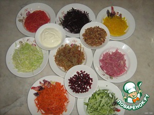 Все овощи шинкуем соломкой.Если капуста жёсткая, солим для мягкости, даём постоять и удаляем жидкость.Лук маринуем с уксусом или лимонным соком,перцем,сахаром,маслом.При использовании квашеной капусты её, иногда, промывают .