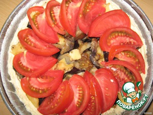 Ёмкость для выпечки (не слишком большую, у меня 17см диаметр) смазать маргарином и обсыпать манкой либо мукой. Выкладываем тесто, равномерно распределяем по дну ёмкости и бортикам. Выкладываем начинку со сковороды. Режем кружочками помидоры (если помидор крупный, то дольками) и укладываем короной.