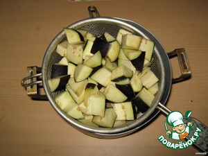 Режем баклажаны кубиками, присаливаем и оставляем на время,чтобы отдали горечь