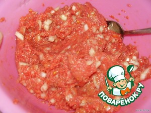 добавляем к нему мелко нарезанную луковицу, у помидоров удаляем шкурку и натираем на крупной терке, также добавляем