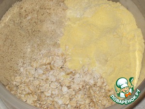 В чашке смешиваем кукурузную муку, овсянку, молотый кунжут, ванилин, соль (настоятельно рекомендую положить, для вкусового баланса) и разрыхлитель.