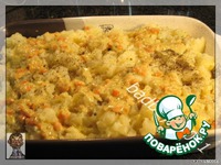 В отваренный и слегка остывший картофель добавляем остаток натертого сыра, немного сливочного масла и перемешиваем, стараемся сохранить целыми кубики картофеля |