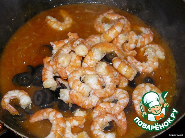 4. Добавляем нарезанные кружочками оливки и креветки. Готовим еще 1 минутку, все время помешивая. |