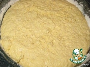Затем, добавить масло, соль, кукурузную муку, размешать, всыпать просеянную обычную муку, замесить тесто. Оно будет чуть прилипать к рукам, ничего страшного. Переложить тесто в миску, смазанную маслом, накрыть и поставить в тепло на 1-1.5 часа, тесто должно увеличится в объеме в 2 раза. -