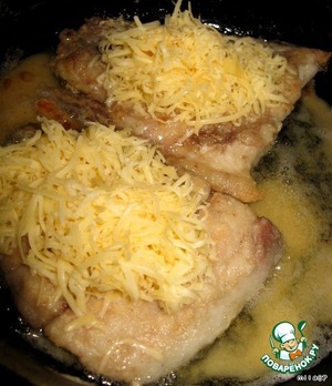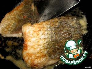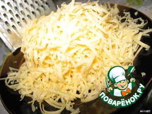 Когда рыбка обжарится с 2-х сторон кладём на сковороду шкуркой вниз. На филе кладём горсть сыра, распределяем по всей поверхности рыбы.