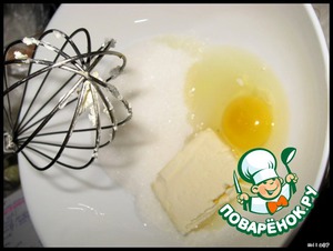При помощи венчика растираем масло, сахар и яйцо...