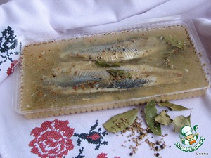 Нам понадобиться филе двух хорошеньких малосольных селедок. Я всегда солю сама. Для этого очищаю сельдь от костей, филе опускаю в маринад: 0,5 л воды, 1 ст. л. соли, 0,5 ст. л. сахара, 1 ст. л. яблочного уксуса, черный перец, кориандр, лаврушка. И так у нас филе ночует. На утро - дивная малосольная селедочка!