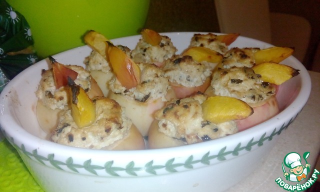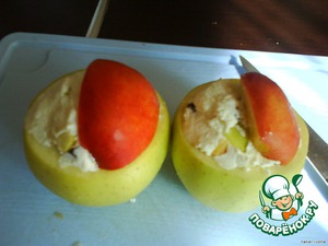 Начинить яблоки творожной массой. Сверху прилепить дольку нектарина