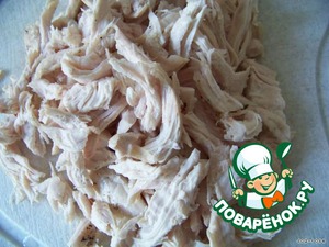 Курицу разбираем на волокна.