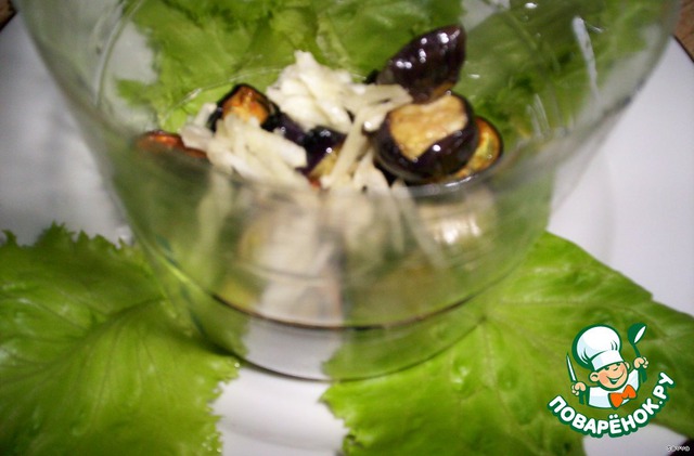 на тарелку поставить форму из бутылки,во внутрь выложить баклажаны + потертый чеснок + майонез