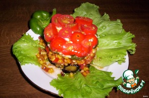 - на тарелку поставить форму из бутылки, во внутрь выложить баклажаны + потертый чеснок + майонез +помидоры+кукурузу + перец + чеснок , майонез + помидоры , чуть -чуть придавить ложкой , аккуратно снять "форму "
