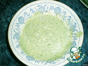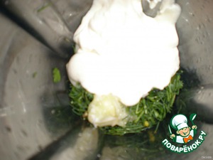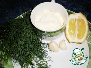 Берём зелень,обрезаем палочки.Чеснок режим пластинами.Смешиваем зелень,чеснок,майонез и сок лимона.