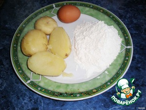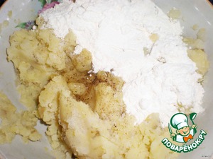 Мнём картофель,добавляем муку и белок.Солим,перчим,перемешиваем.