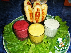 Картофельные палочки с соусом морковным, свекольным и зелeным. Очень вкусно. На конкурс "Овощной светофор".