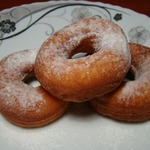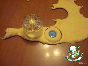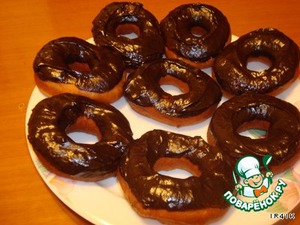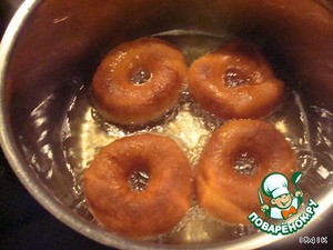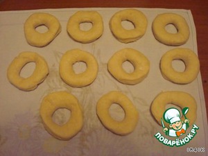 После того как тесто подойдет обмять его и раскатать в пласт 1 см. стаканом диаметр 6-7 см. вырезать пончики в центре пробкой от бутылки удалить центр.