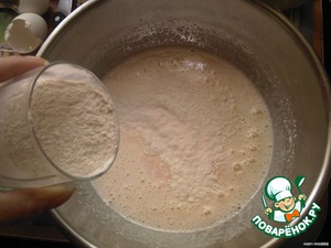 Добавляем муку по чуть-чуть, порциями, готовое тесто должно напоминать густую сметану
