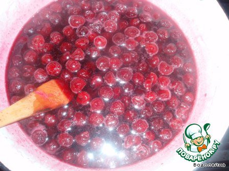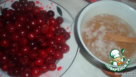 Вишни отделяем от косточки, а из сахара и воды делаем сироп (доводим до кипения, помешивая. Можно проварить его пару минут, чтоб сахар растворился.)