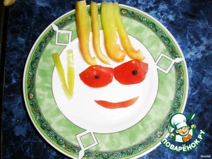 Из помидоров сделать глазки, а из перца зрачки. Так же, из помидора, сделать рот. Из болгарского перца сделать лапки и усики.