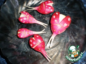 Из редиса делаем божьих коровок. Одну сторону срезать для устойчивости. Для усиков разрезать хвостики по длине. На верхней стороне вырезать крылышки,а на них сделать выемки и приделать их зубочистками. Вставить глазки из горчицы.