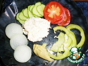 Помидоры и огурцы нарезаем кольцами. Лук окунаем в горячую,а затем, в холодную воду, и нарезаем кольцами. Перец полукольцами. Сыр с чесноком трём на тёрке и заправляем майонезом.
