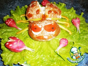 Закуска на булочке, в виде жука и божьей коровки, из редиса. На конкурс "Овощной светофор".
