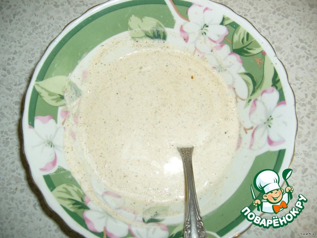 Готовим соус: 2 ст. ложки сметаны и 1,5 ст ложки майонеза перемешиваем, потом добавляем перец черный (молотый) и перец красный (молотый) и приправу к мясу. Все хорошенько перемешиваем. Когда мясо стушится, берем от него 5-6 столовых ложек бульона, добавляем в наш соус и перемешиваем