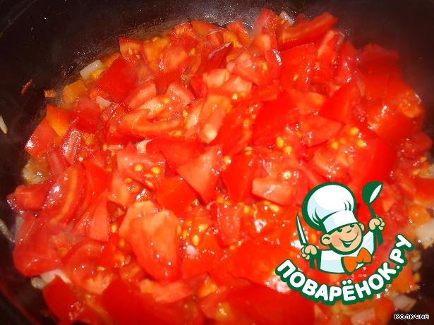 тушим пару минут, потом кладем помидоры. Крышкой НЕ НАКРЫВАЕМ!