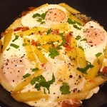теперь берем яйца, такое количество, сколько вы собираетесь съесть. у меня было 5 шт. Вбиваем туда, солим и накрываем крышкой, чтобы белок прихватился, а желток растекался. Думаю, так любят многие!