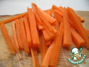 Морковь режем соломкой и тоже отправляем в след за картошкой.