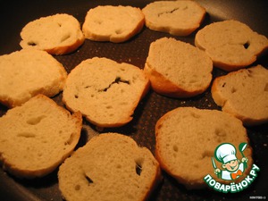 Багет нарезаем средней толщины. В этот раз я багетки немного подсушила, чтобы типа греночки получились. Но это не обязательно. Можно и не сушить. На Ваш вкус:) Получается и так, и так вкусно.