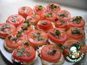 Теперь на каждую намазанную багетку, кладем кружочек помидора, посыпаем смесью прованских трав с перцем, немного все солим, посыпаем нарезанным базиликом (или сухим если нету свежего)