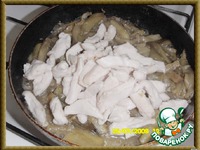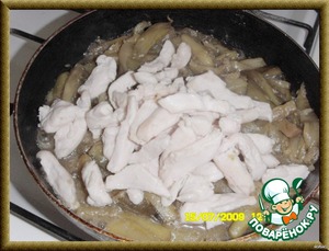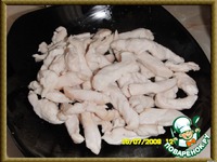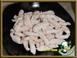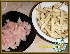 Грудки у меня было 2 штуки,нарезать вдоль на полоски шириной 1 см, баклажаны каждый разрезать вдоль пополам,нарезала полосками
