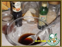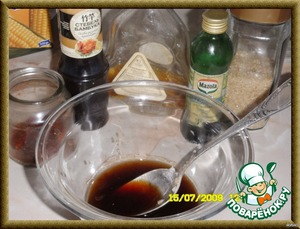 Смешайте в небольшой миске соевый соус со следующими 5 ингредиентами.60 мл соевого соуса,60 мл красного винного уксуса-заменила обычным уксусом),3 ст. ложки сахара,2 ст. ложки кунжутного масла