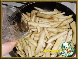 имбирь, чеснок выложить в сковородку,добавьте баклажаны,и 60 мл воды к соку на сковороде и доведите до кипения.Убавьте огонь до среднего уровня; накройте и жарьте, помешивая, около 20 минут, пока жидкость не испарится.