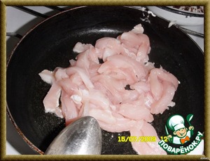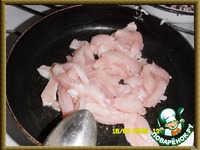 Слова автора.Разогрейте на сильном огне масло на сковороде диаметром 30 см или в котелке.Выложите курицу и жарьте, постоянно помешивая, пока она полностью не потеряет свою розовую окраску.