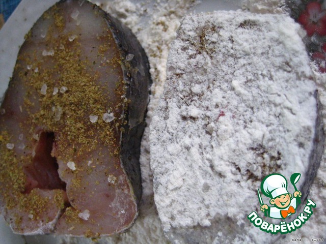 Солим, натираем пряностями для рыбы, обваляем в муке.