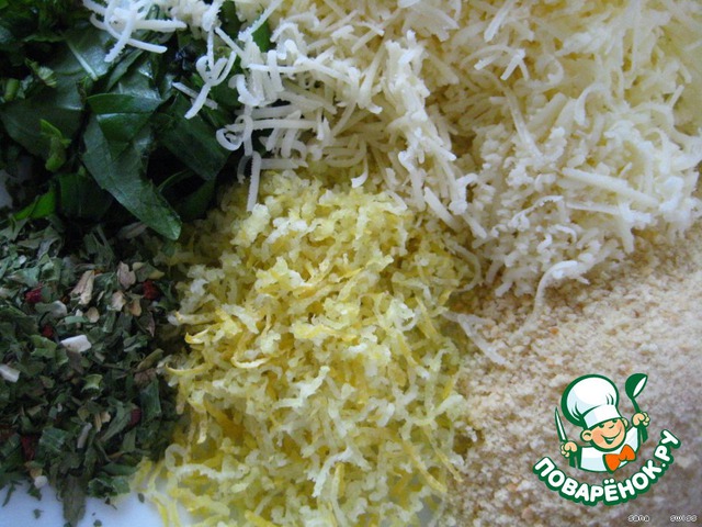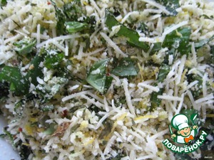 Перемешиваем сыр, измельченную зелень, лимонную цедру и сухари.