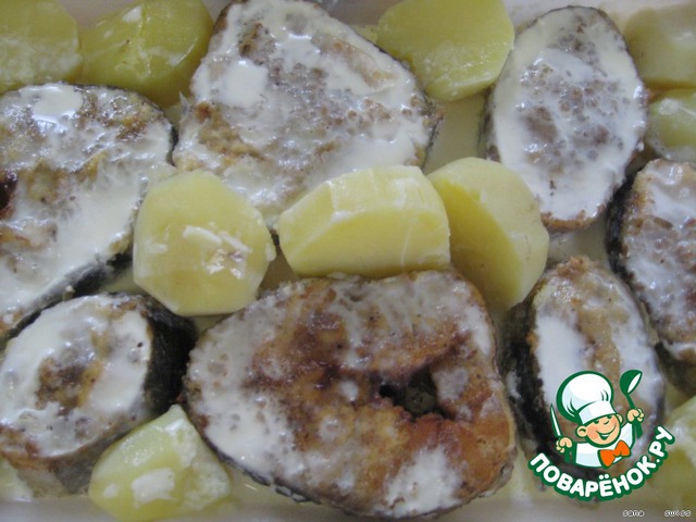 Рыбу заливаем сливками и при желании добавляем отварной картофель (тогда сразу получим и гарнир).
