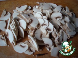 Готовим соус: шампиньоны нарезать, обжарить, залить сметаной, потушить, добавить специи, соевый соус и снять с огня, охладить. -