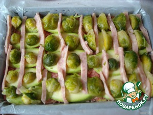 Далее слой брюссельской капусты и слой ветчины по рецепту, но у меня было мало и я выложила это вперемешку.