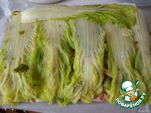 Дно формы застелить листьями пекинской капусты.
